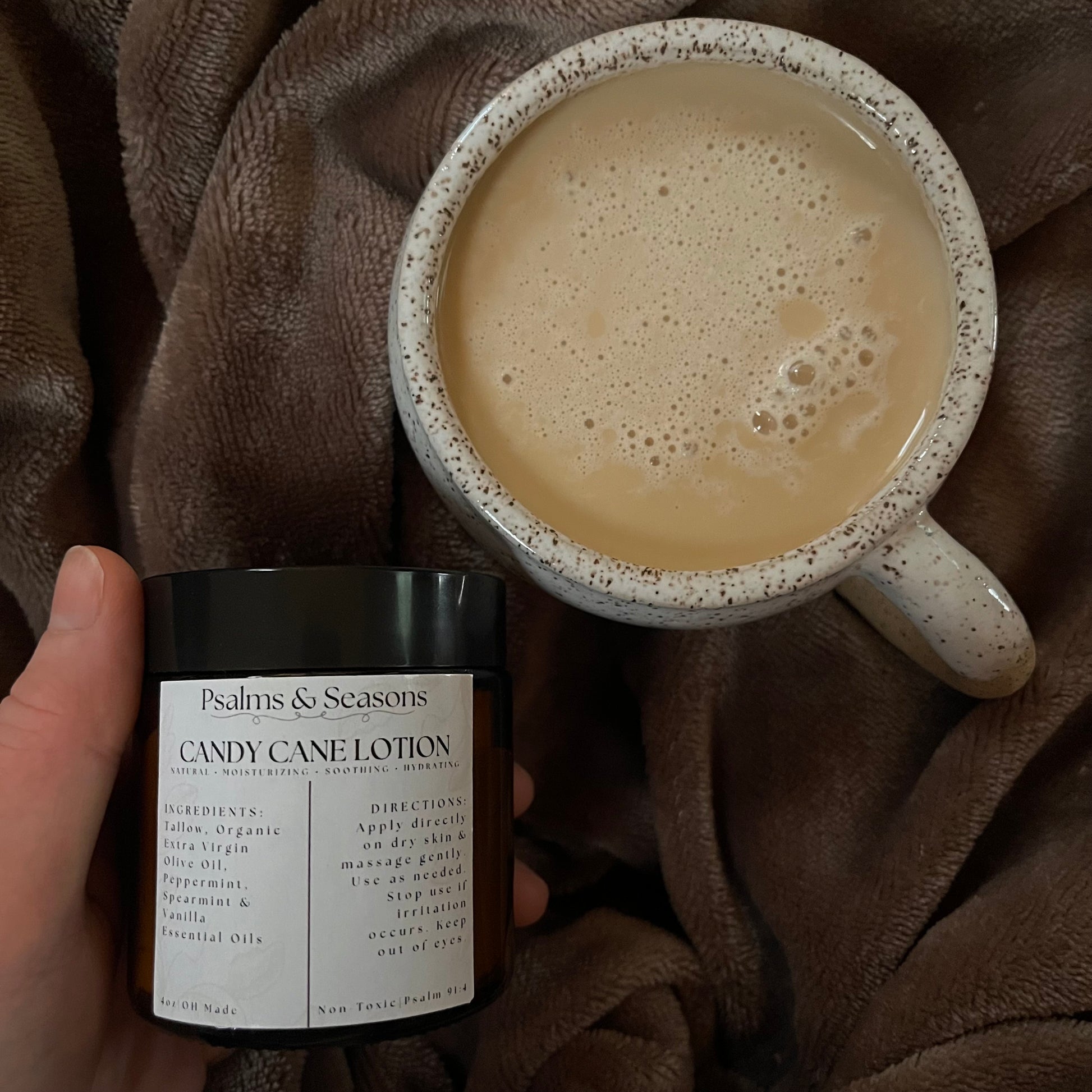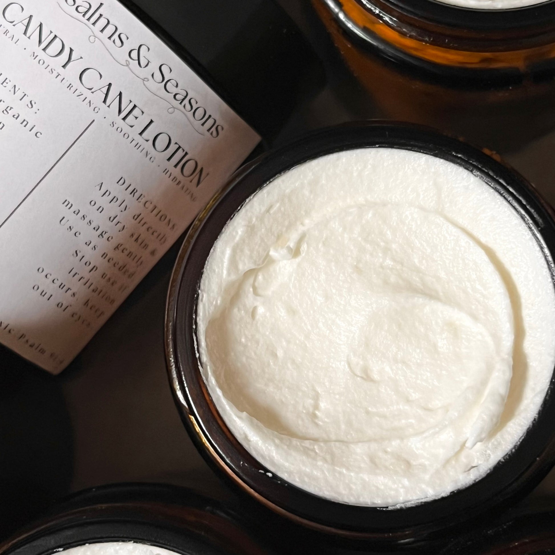 Enjoy the joy and warmth of the holidays with our Whipped Candy Cane Lotion. Made with tallow and organic extra virgin olive oil, this moisturizing & cooling lotion has cozy scents of Spearmint, Peppermint, and Vanilla essential oils. Keep your hands nourished while reminiscing or making those cherished holiday memories.