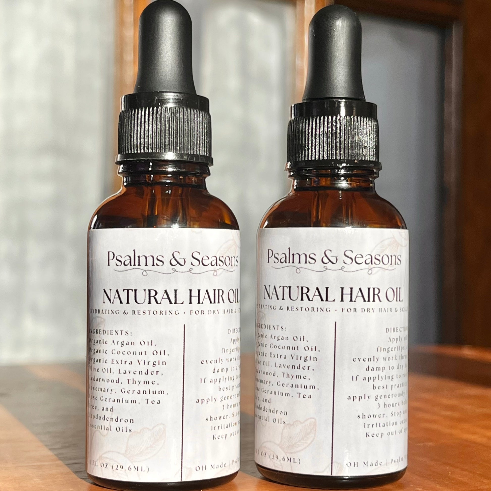 Tired of your dry hair and itchy scalp? Try our new Natural Hair Oil! Our carefully crafted hair oil is made with hydrating, nourishing, moisturizing, and organic Argan, Coconut, and Extra Virgin Olive Oils, as well as eight strengthening, scalp and hair follicle stimulating, shining, rebalancing, soothing essential oils -Lavender, Cedarwood, Thyme, Rosemary, Geranium, Rose Geranium, Tea Tree, and Rhododendron Essential Oils. Say hello to hydrated, smooth, shining locks, and goodbye to your dry, itchy, scalp!