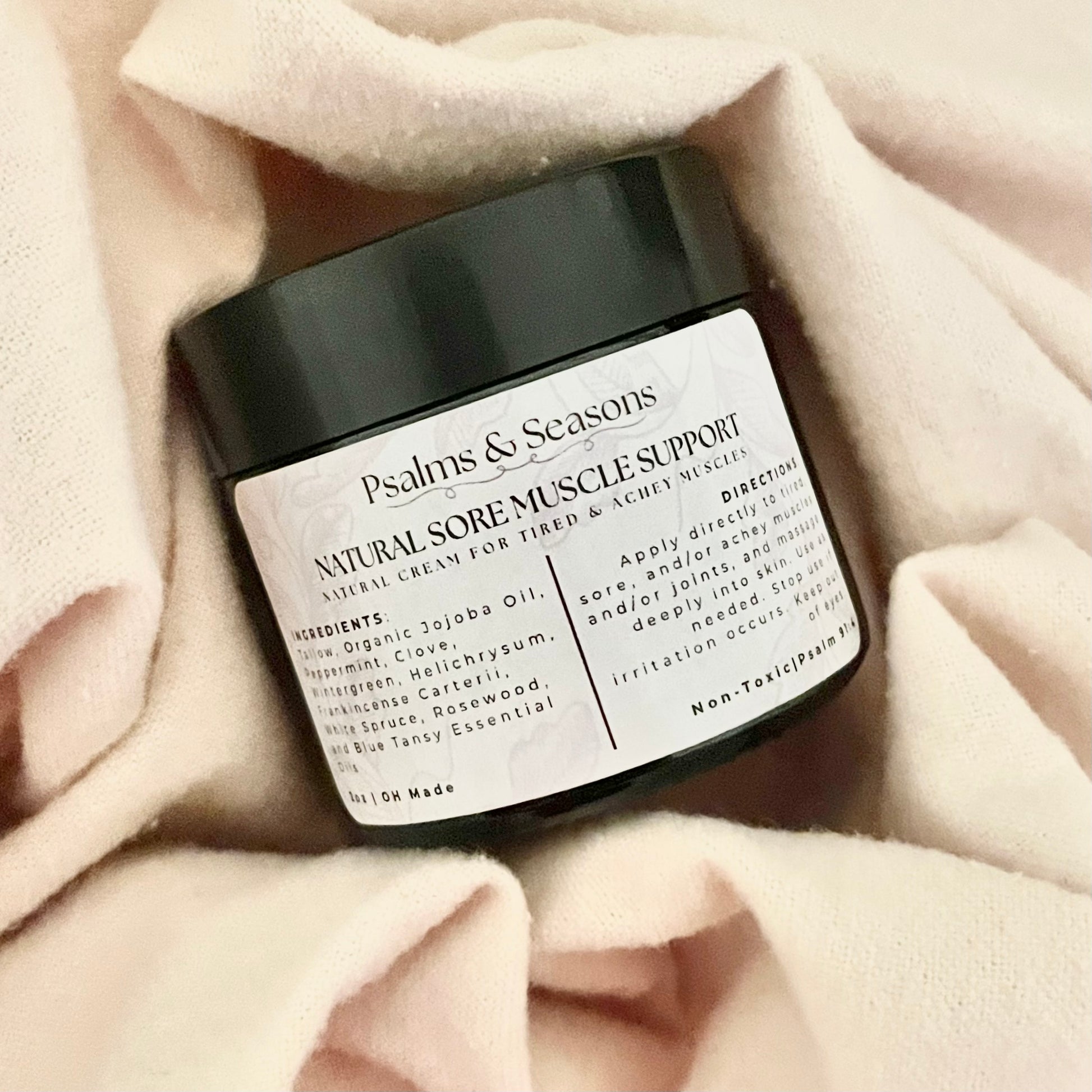 Our cream is crafted with nutrient rich tallow, hydrating jojoba oil, and a great blend of muscle supporting essential oils - Peppermint, Clove, Wintergreen, Helichrysum, Frankincense Carterii, White Spruce, Rosewood, and Blue Tansy, which all work together beautifully that may help bring you some relief to your tired and achey muscles.