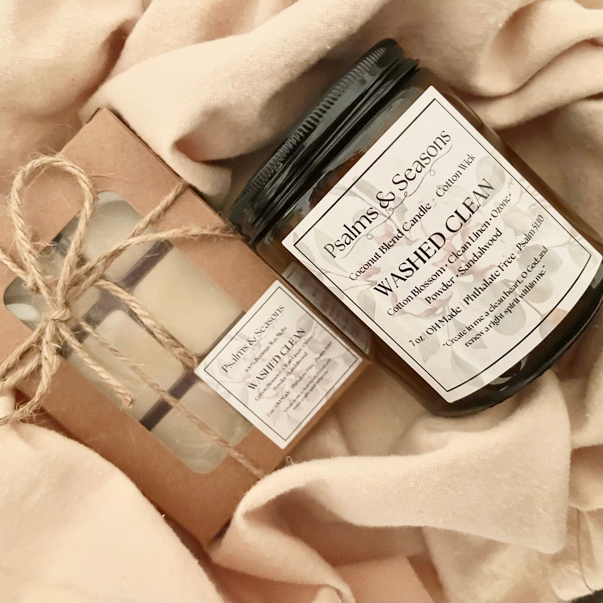 Our Washed Clean Bundle comes with our coconut blend candle and 100% beeswax wax melts that will bring a scent of fresh and clean cotton and linen into your home. Unwind, relax, and enjoy this refreshing scent offering notes of cotton blossom, clean linen, ozone, powder, and sandalwood!